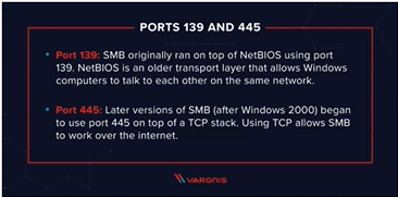 Port 445: Later versions of SMB (after Windows 2000) began to use port 445 on top of a TCP stack. Using TCP allows SMB to work over the internet.