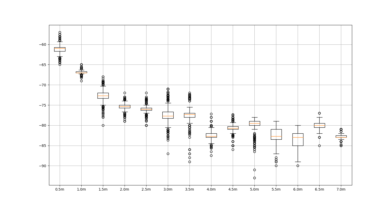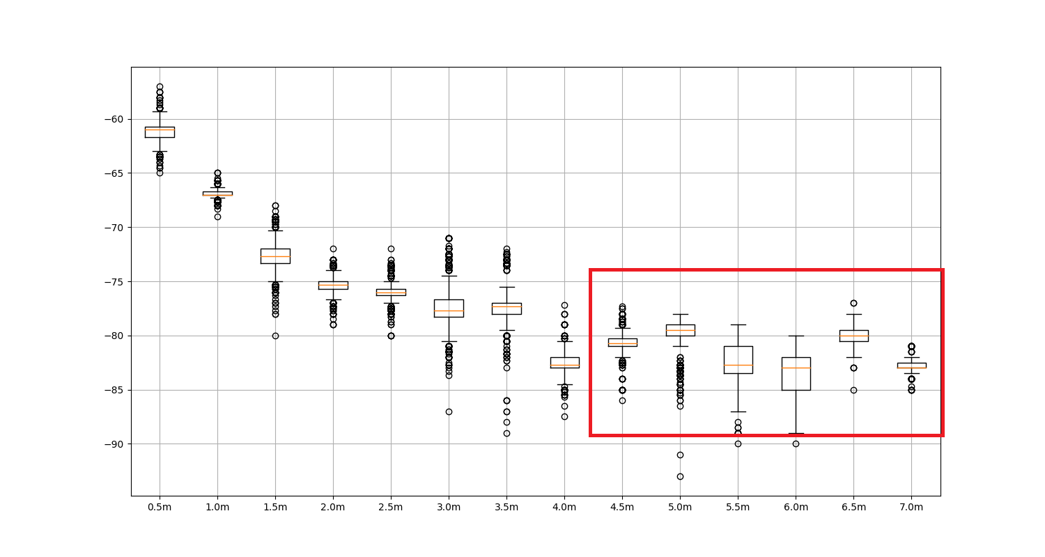 4.0m 이 후는 거의 RSSI가 요동치는 것을 확인할 수 있다. BLE를 Indoor Position을 하려면, BLE 배치를 최소 4m 간격으로 하던지, 거리별 정확한 RSSI를 구하는 알고리즘이 필요하다.