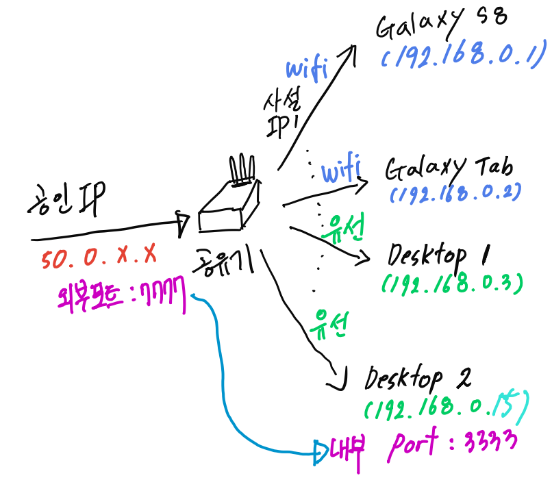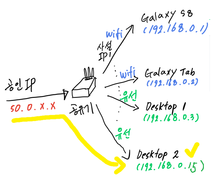 50.0.x.x:3333์ผ๋ก ๊ธธ์ ์๋ดํด์ค๋๋ค. 3333ํฌํธ๋ 192.168.0.15์ ์ฃผํผํฐ ๋ ธํธ๋ถ ์๋ฒ๋ฅผ ๊ฐ๋ฆฌํต๋๋ค.