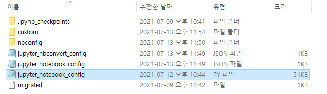 ์ ๋ ์ฃผํผํฐ ๋ ธํธ๋ถ ํ ๋ง, ํ์ฅ ํ๋ก๊ทธ๋จ์ ๊ฑด๋๋ ธ๊ธฐ ๋๋ฌธ์ ๋ง์ ํ์ผ๋ค์ด ์์ง๋ง, ์ฒ์ ์ค์ ํ์๋ ๋ถ๋ค๊ป์๋jupyter_notebook_config.py๋ง ์์ต๋๋ค.