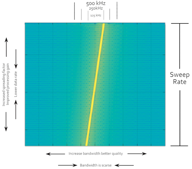 장거리 통신이 가능한 이유는 중간에 끊기더라도 주파수의 크기가 아닌 변화에 대해 감지하기 때문에 최대한 Chirp의 세로축을 늘릴수록 유리하다. 하지만 그만큼 하나의 Chirp이 보내지는데 시간(ToA:Time on Air)이 늘어나기 때문에 그만큼 속도가 느려진다. 즉, 통신 거리와 시간은 Trade-Off 관계이므로 적절한 파라미터를 찾는 것이 중요하다. 자세한 내용은 다음 글에서.