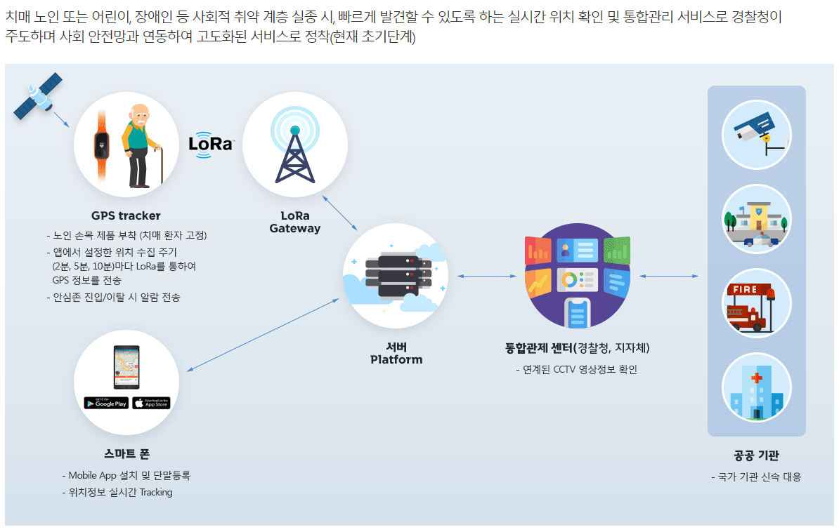 ED에 GPS를 장착해 위치를 GW/NS 로 보내고 AS에서 공공기관으로 Integration 하는 방식인 것 같습니다. ( 일반적인 LoRaWAN이므로, 당연한 이야기입니다. )