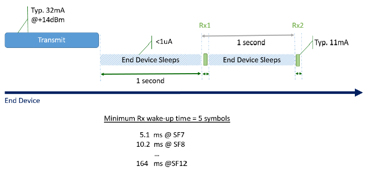 위 그림을 자세히 보면 Class A가 배터리 효율적인 이유를 알 수 있습니다. ED가 uplink를 송신하고 일정 시간 동안만 수신 윈도우(RX)를 여는 시간을 제외하고는 대부분을 Sleep 상태로 유지합니다.