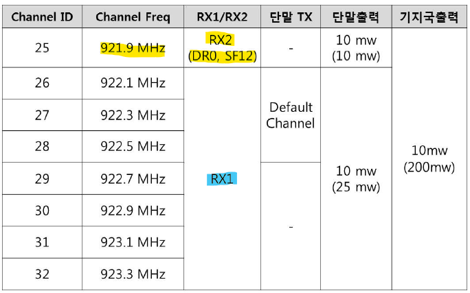 RX1은 922.1~923.3MHz 대역에서 SF7~SF12를 사용할 수 있습니다.