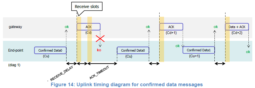참고 LoRa Alliance Link Layer Specification v1.0.2 Confirmed mode : Confirmed mode에서 모든 Uplink(End Device(ED)에서 Network Server(NS)로 전송된 패킷) 후에 Class A ED는 두 개의 수신 창(RX)을 사용하..