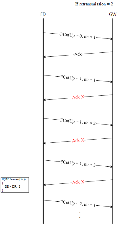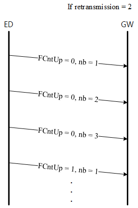 Retransmission은 말 그대로 Uplink Packet을 GW가 수신 받지 못했을 경우를 대비해 재전송하는 방법입니다. 당연히 똑같은 Packet을 전송하므로 FCntUp은 증가하지 않습니다.