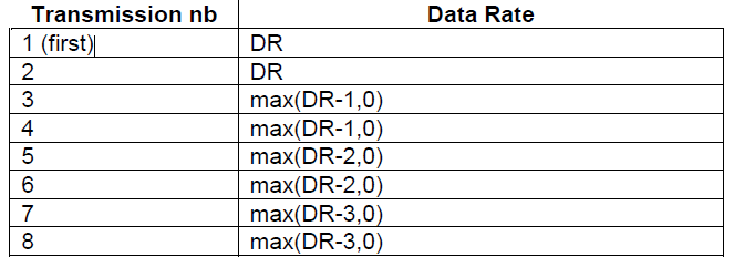 confirmed mode의 경우, Uplink Packet에 대한 ACK를 수신하면, 재전송하지 않고 다음 Packet을 전송합니다. 하지만 ACK를 수신하지 못하면, 재전송을 시작하는데, 아래 테이블과 같이 DR을 설정하는데, 이를 ED의 Adaptive Data Rate(ADR)이라고 합니다.