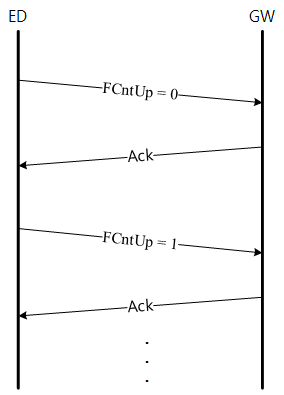 Confirmed mode : Confirmed mode에서 모든 Uplink(End Device(ED)에서 Network Server(NS)로 전송된 패킷) 후에 Class A ED는 두 개의 수신 창(RX)을 사용하여 확인 알림으로 NS의 ACK를 요구합니다.