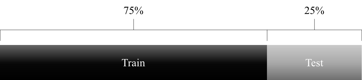 -test_size : 0~1 ์ฌ์ด์ ๊ฐ์ผ๋ก, ๊ธฐ๋ณธ test size๋ 0.25๋ก ์๋์ผ๋ก train size๋ 0.75์ด๋ค. ์๋์ ๊ทธ๋ฆผ์ฒ๋ผ ๋ฐ์ดํฐ๋ฅผ ๋ถํ .