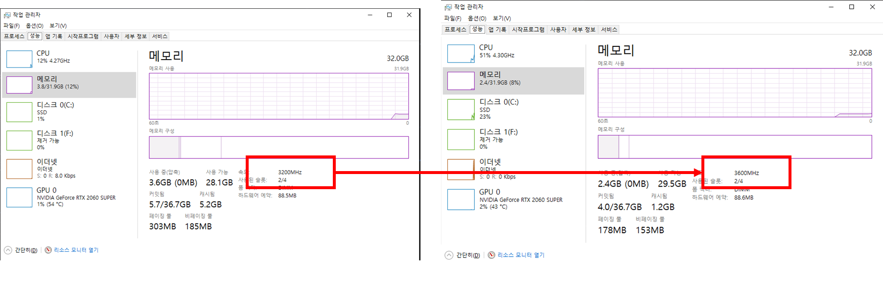 저장 및 리셋 후 작업관리자에서 3200에서 3600으로 올라간 것을 확인한다.
