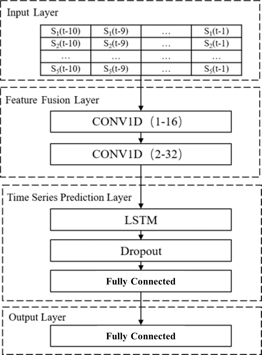 Conv1D + LSTM ๋ชจ๋ธ์ ๊ทธ๋ฆผ 1๊ณผ ๊ฐ์ด Conv1D ๊ธฐ๋ฐ์ ํน์ง ์ตํฉ ๋ ์ด์ด, LSTM ๊ธฐ๋ฐ ์๊ณ์ด ์์ธก ๋ ์ด์ด, output layer๋ก ๊ตฌ์ฑ๋๋ค. Input layer์๋ ๊ทธ๋ฆผ 0๊ณผ ๊ฐ์ ์๊ณต๊ฐ์ ํน์ฑํ๋ ฌ์ด ์ ๋ ฅ๋๋ค. ๊ฐ ๋ณ์๋ CNN์ ์ํด โโ๊ฐ์ค์น๊ฐ ๋ถ์ฌ๋๊ณ ๋ณ์ ๊ฐ์ ์ ๋ณด๊ฐ ๊ฒฐํฉ๋๋ค. ๊ณผ์ ํฉ(Overfitting)์ ํผํ๊ธฐ ์ํด dropout layer๊ฐ ๋คํธ์ํฌ์ ์ถ๊ฐ๋ฉ๋๋ค. ๋ชจ๋ธ ํ๋ผ๋ฏธํฐ๋ ๊ทธ๋ฆผ 4์ ๊ฐ์ด ๊ตฌ์ฑํ๋ค.