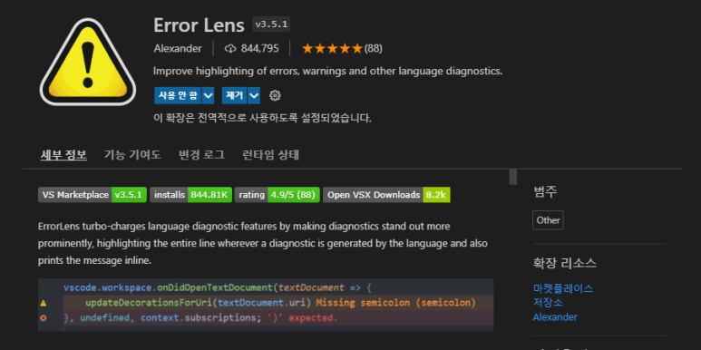 이번에 소개하는 확장 프로그램은 Error Lens이다.