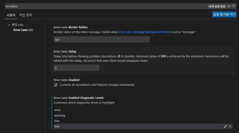 Error Lens에는 구성 설정 섹션도 있다. 지연을 설정하여 오류를 표시하고 각 오류 유형에 대한 색상을 변경할 수 있다.