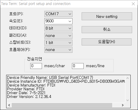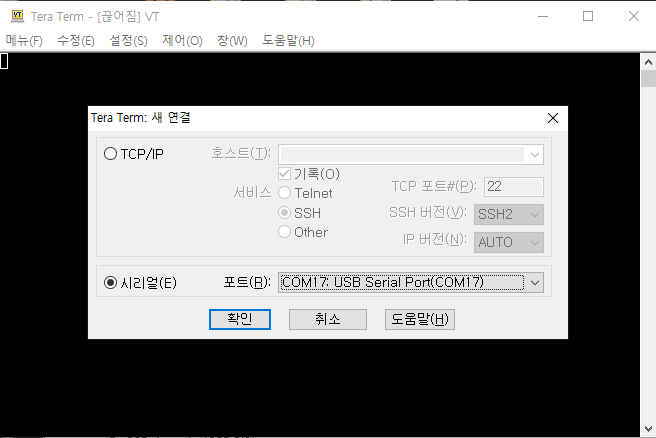 1. Teraterm์ ์คํํ๋ฉด ์๋์ ํฐ๋ฏธ๋ ์ฐฝ์ด ์ด๋ฆฐ๋ค. ์๋ฆฌ์ผ ํฌํธ๋ ์ฐ๋ฆฌ๊ฐ ์ฐ๊ฒฐํ UART to USB๋ฅผ ์ ํํ๋ค.