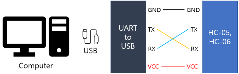 UART to USB์ HC-05, HC-06์ ์ ์ฐ๊ฒฐ์ ๊ทธ๋ฆผ๊ณผ ๊ฐ๋ค. TX์ RX๋ ์๋ก ๊ต์ฐจํ๋ ๊ฒ์ด ๋ง๋ค.