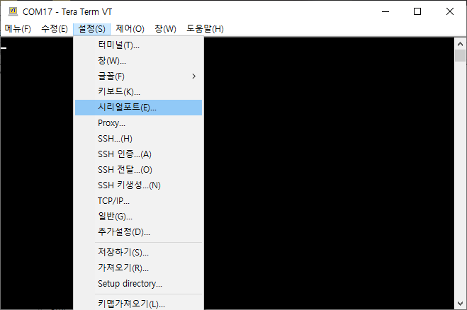 2. [์ค์ ] - [์๋ฆฌ์ผ ํฌํธ]๋ฅผ ํด๋ฆญํ๋ค.