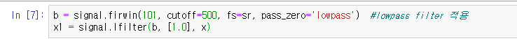 ์ฐจ์๋ 101, ์ฐจ๋จ์ฃผํ์๋ 500hz, ํํฐ๋ low pass filter๋ฅผ ์ฌ์ฉํฉ๋๋ค.