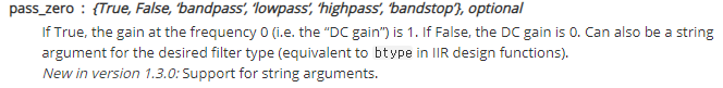 If True, the gain at the frequency 0 (i.e. the “DC gain”) is 1. If False, the DC gain is 0. Can also be a string argument for the desired filter type (equivalent to btype in IIR design functions). New in version 1.3.0: Support for string arguments.