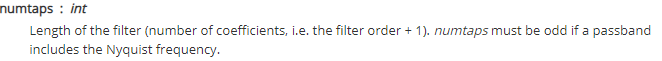 ์ฃผ์์ฌํญ์ผ๋ก ์ฐจ์๋ must be odd if a passband includes the Nyquist frequency๋ผ๊ณ