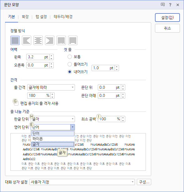 줄 나눔 기준에서 영어 단위를 단어에서 글자로 변경한다.