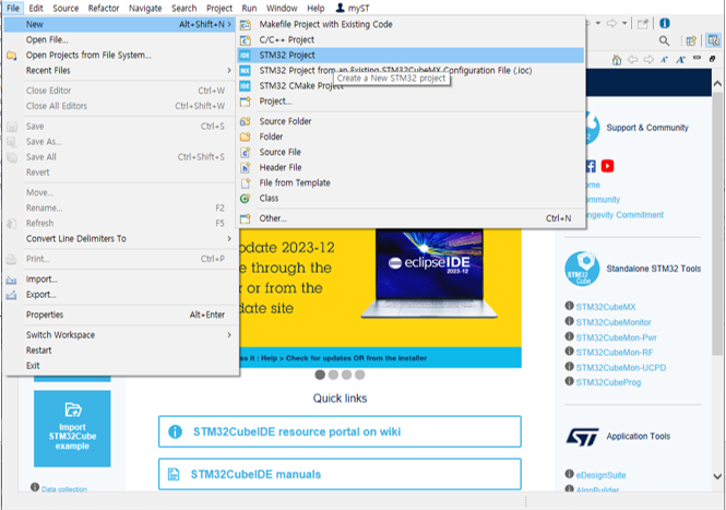 [File] - [New] - [STM32 Project]๋ฅผ ํด๋ฆญํ๋ค.