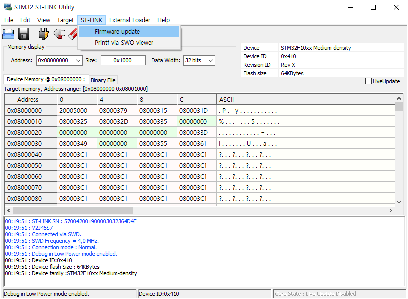 제품이 연결된 것을 확인했다면, [ST-LINK]에서 [Firmware update]를 클릭한다.