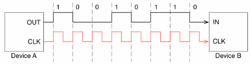 - ํด๋ญ ์ ํธ ๋ผ์ธ: ๋๊ธฐ ํต์ ์์๋ ์ถ๊ฐ์ ์ธ ํด๋ญ ์ ํธ ๋ผ์ธ(์: SCLK)์ด ํ์ํ๋ค.
