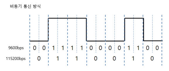 - ๋น๋๊ธฐ ํต์ : ๋ณ๋์ ํด๋ญ ์ ํธ ์์ด ์ก์ ๊ธฐ์ ์์ ๊ธฐ๊ฐ ๋์ผํ ์ ์ก ์๋(baud rate)๋ก ์ค์ ๋์ด์ผ ํ๋ค.