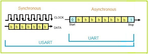 - ๋๊ธฐ/๋น๋๊ธฐ ํต์ ์ง์: USART๋ ํด๋ญ ์ ํธ๋ฅผ ์ฌ์ฉํ ๋๊ธฐ ํต์ ๊ณผ ํด๋ญ ์ ํธ ์์ด ๋ฐ์ดํฐ ์ ์ก ์๋(baud rate)๋ก ์ค์ ๋ ๋น๋๊ธฐ ํต์ (UART)์ ๋ชจ๋ ์ง์ํ๋ค.