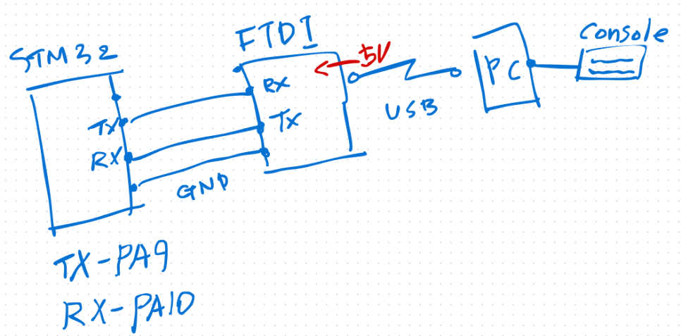STM32์ FTDI์ ์ฐ๊ฒฐ์ Tx, Rx ์๋ก ์ญ์ผ๋ก ์ฐ๊ฒฐํ๊ณ VCC๋ ๋ณ๋๋ก ์ฐ๊ฒฐํ์ง ์์๋ ํต์ ์ ๋๋ค. (USB๋ก ์ ์์ด ๋ค์ด๊ฐ๋ ๋ฏ ํ๋ค.)