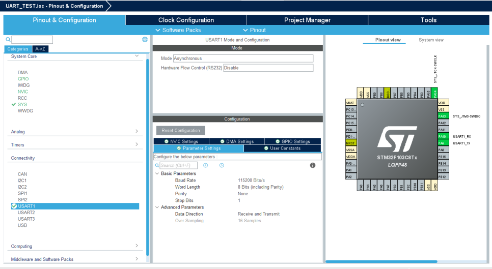 ์ด๋ฒ ์์ ๋ UART 1๋ฒ์ ์ฌ์ฉํ๋ค. (PA10 - UART1_RX, PA9 - UART1_TX)