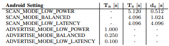 안드로이드 BLE 개발 공식 문서를 보면 Scan window, Scan interval, channel은 변경하지 못하고, mode로 선택할 수 있다.