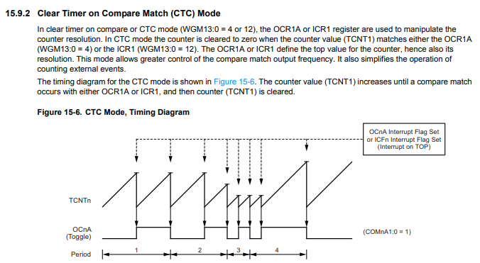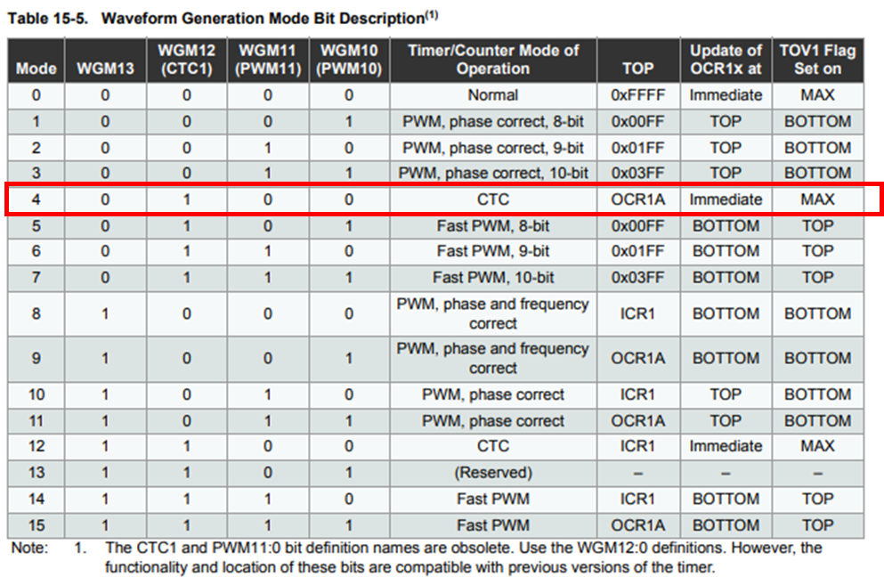 TCCR1B |= (1 << WGM12); /* CTC ๋ชจ๋ ์ค์ (Clear Timer on Compare Match) */