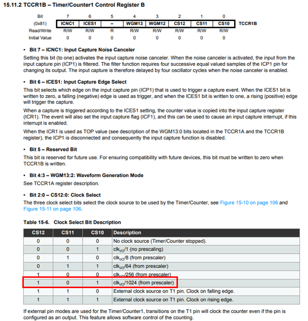 TCCR1B |= (1 << CS12) | (1 << CS10); // ๋ถ์ฃผ๊ธฐ 1024