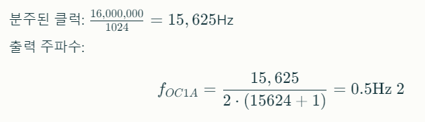 OCR1A = 15624; /* ๋น๊ต ๊ฐ ์ค์ (16MHz / 1024 / 1Hz - 1) */
