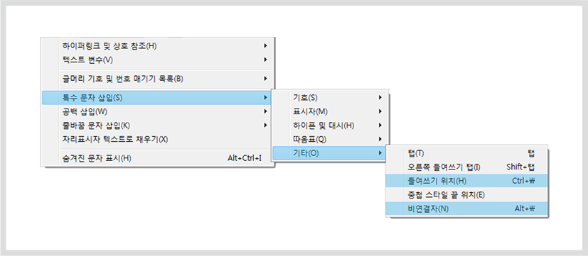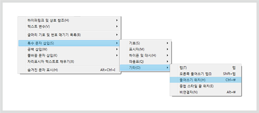 2. [문자] 메뉴의 [특수문자 삽입] - [기타] - [ 들여쓰기 위치 Ctrl + \ ]를 선택합니다.