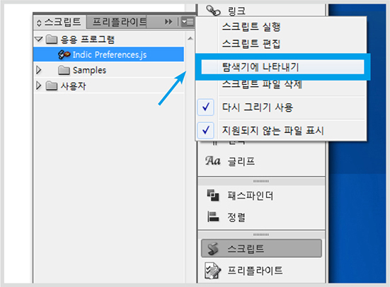 1. [ 스크립트 패널 ] 을 열어서 [ 탐색기 나타내기(탐색기에 표시) ] 를 선택하면