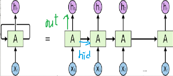 A 박스에 input X0의 값이 들어가면, output은 h0 의 값을 반환하고 hidden은 다음 Sequnece의 A박스에 값이 들어가므로 output과 hidden의 값을 반환합니다.