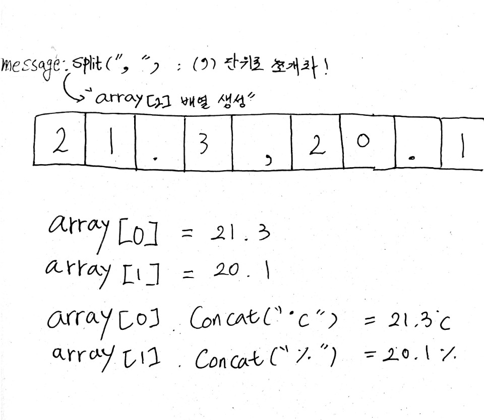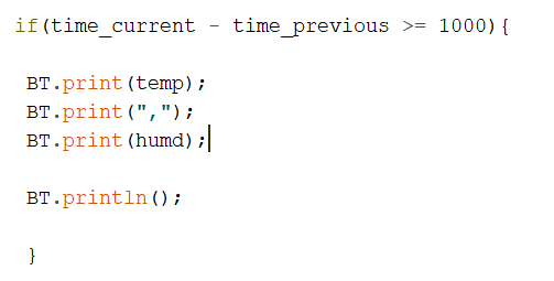 [temp(value), humd(value) /n] ์ด๋ฌํ ํํ์ ๋ฌธ์์ด๋ก 1์ด์ ํ ๋ฒ์ฉ ๋ธ๋ฃจํฌ์ค์๊ฒ ๊ฐ์ ๋ณด๋ด์ค๋๋ค.