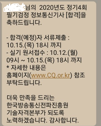 오늘 정보통신기사 필기 합격 문자가 날라왔습니다.
