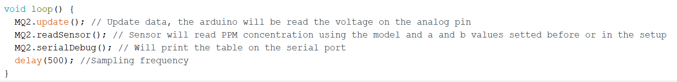MQ2.readSensor(); // Sensor will read PPM concentration using the model and a and b values setted before or in the setup