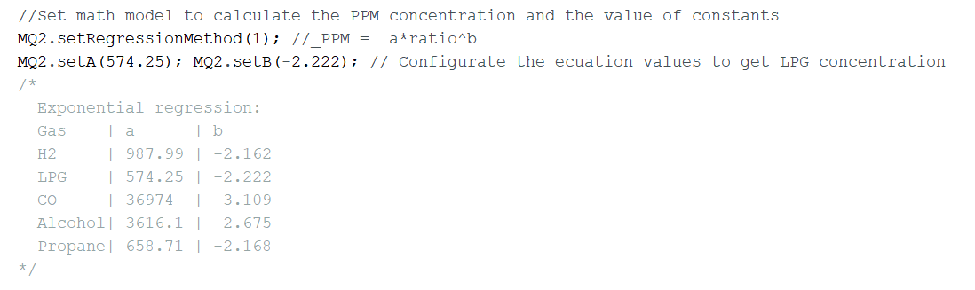 MQ2.setA(574.25); MQ2.setB(-2.222); // Configurate the ecuation values to get LPG concentration